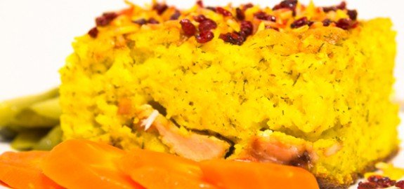 قالب مورد نظر خود را چرب میکنیم و یک لایه برنج میریزیم و لایه ی بعدی را مرغ میریزیم و در آخر نیمه باقی مانده برنج را میریزیم و به مدت 30 دقیقه در فر دمای 180 درجه قرار میدهیم