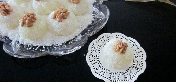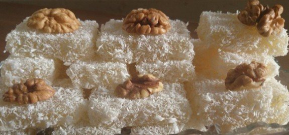 مخلوط را در ظرف مورد نظر ریخته و پس از اینکه سرد شد برش بزنید با گردو و نارگیل تزیین کنید