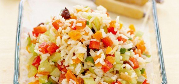 سبزیجات خرد شده را در یک کاسه بزرگ میریزیم و مخلوط روغن زیتون را اضفه میکنیم و مخلوط میکنیم و سپس برنج را اضافه میکنیم و به آرامی مخلوط میکنیم