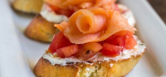 کرم را روی نان میزنیم و پیاز و گوجه را میریزیم و چند برش سالمون روی آن میریزیم